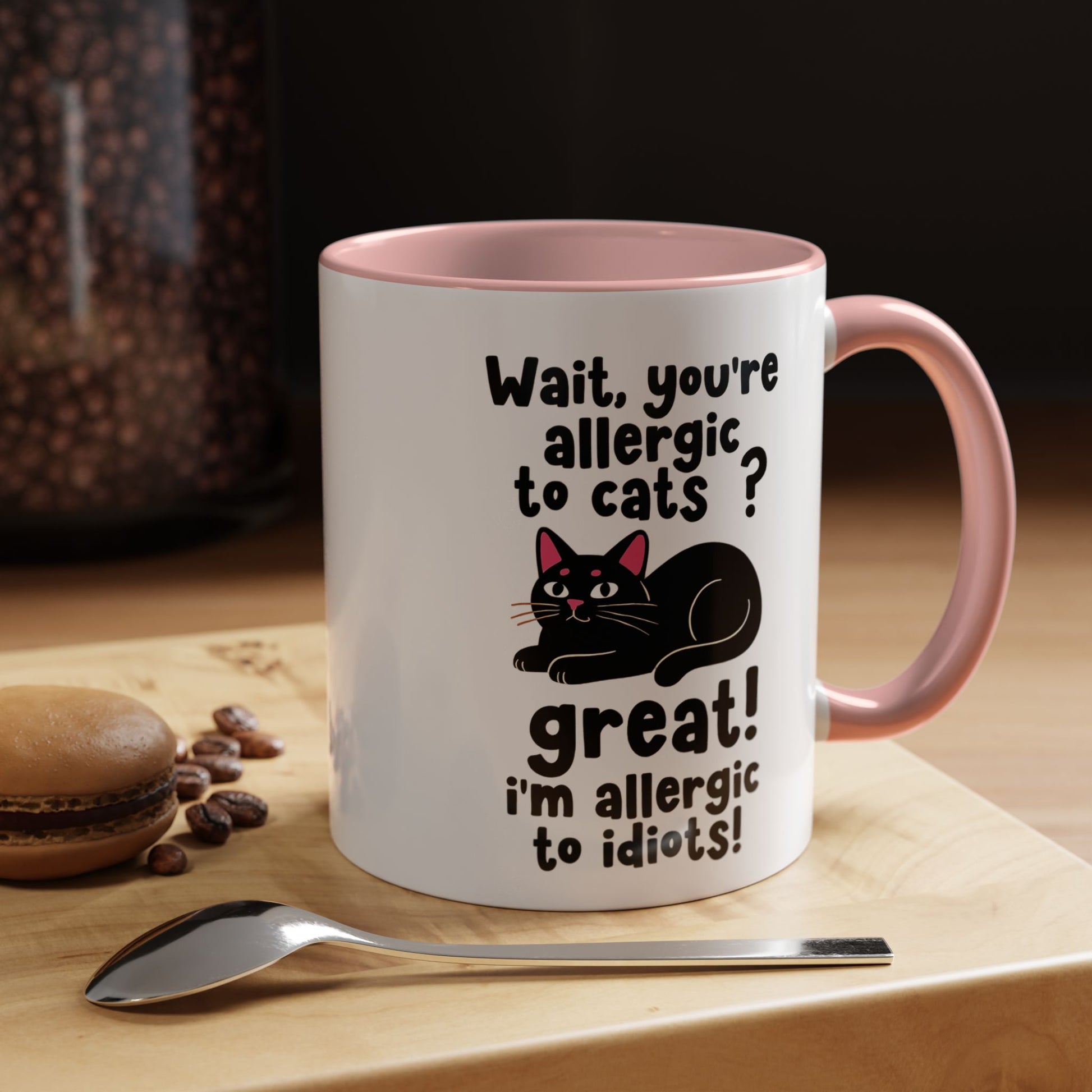 Cat Allergy Funny Coffee Mug — "Wait, you're allergic to cats? Great! I'm allergic to idiots!"