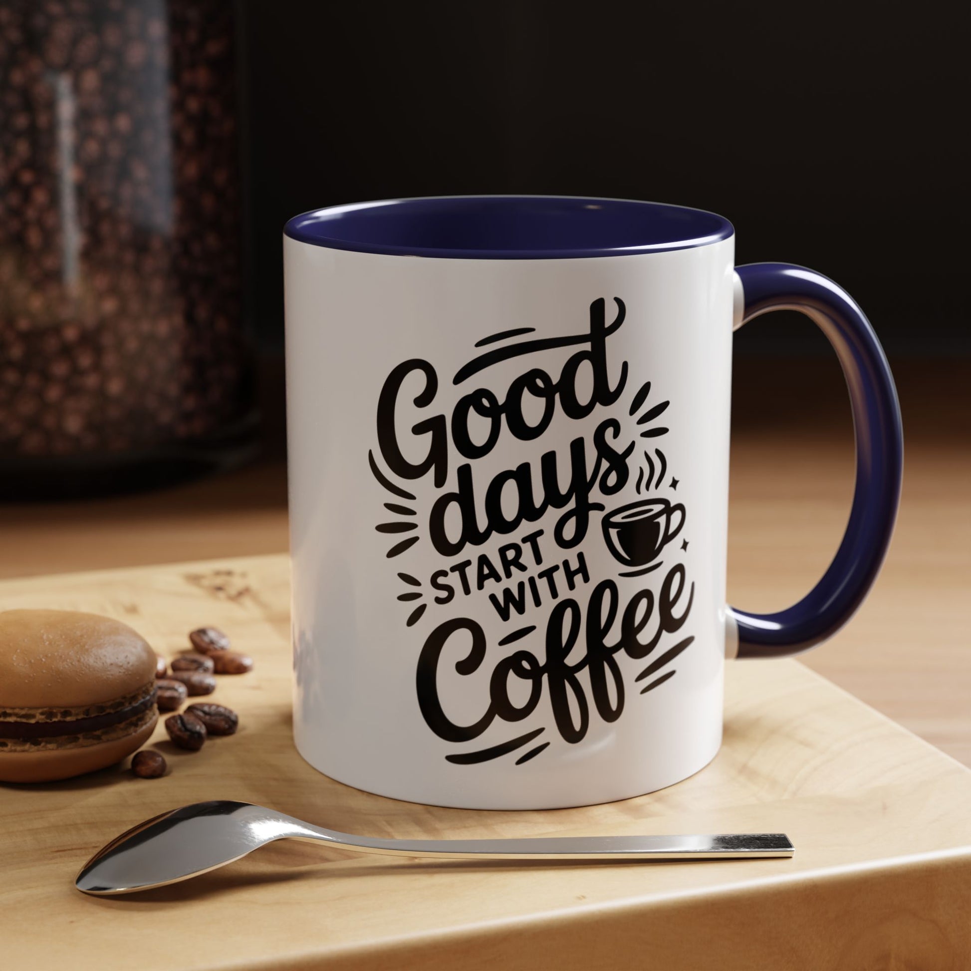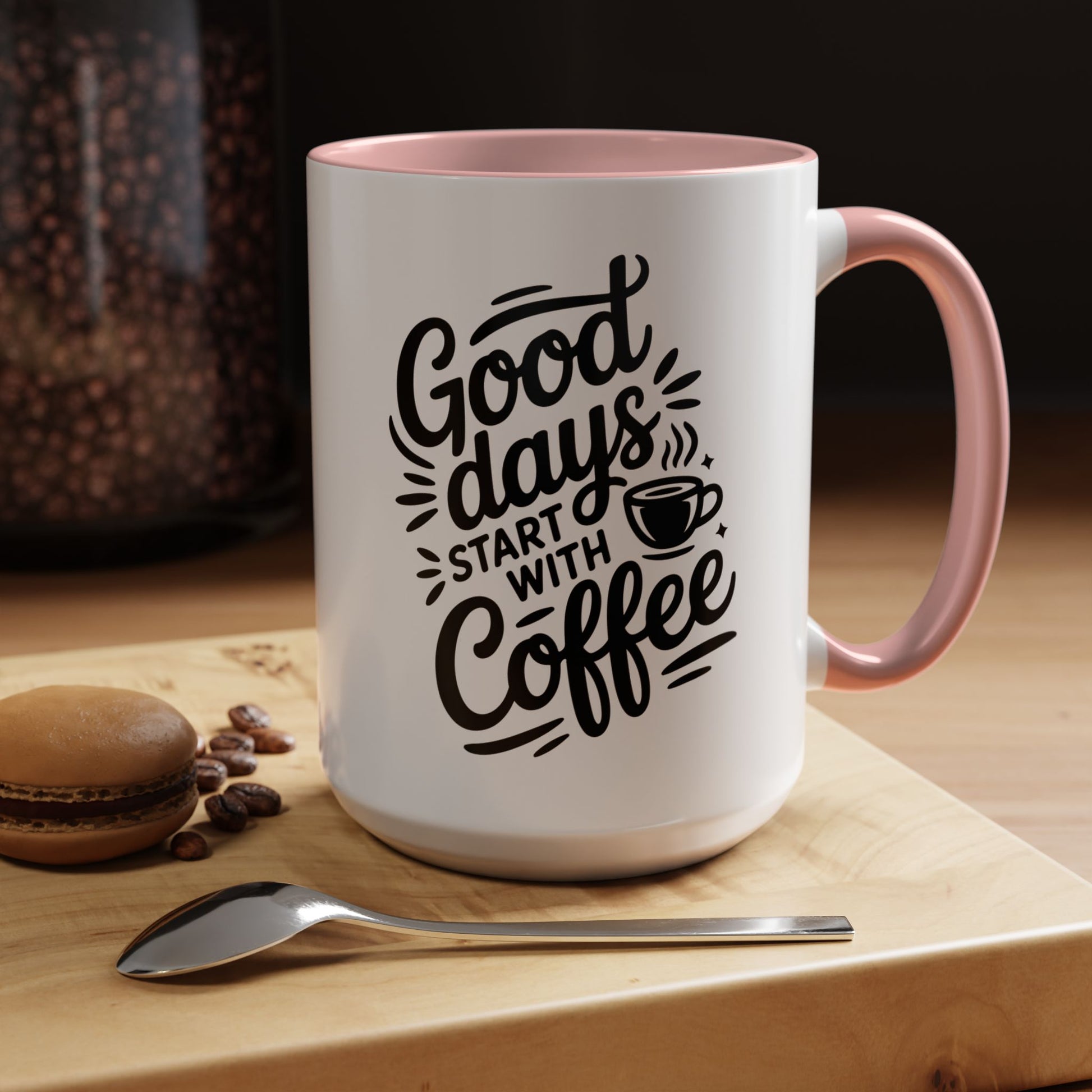 Mug designed for slow, meaningful mornings. Glossy white ceramic wraps a hand-lettered message: "Good days start with coffee," in bold black script. A colored interior and C-shaped handle add a pop of contrast that catches the eye when you lift it for a first sip. It feels weighty and reassuring in your hands, the heat from the brew warming your fingers as the message nudges you into a calm, focused start. For people who treat coffee as a ritual, this mug becomes part of the routine — the signal to sit down, breathe, and plan the day. It pairs naturally with quiet countertops, laptop-strewn desks, or the soft hum of a kitchen radio on weekend mornings.