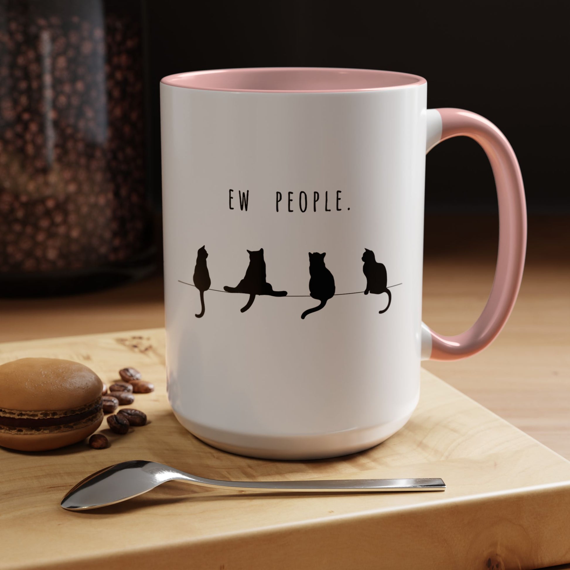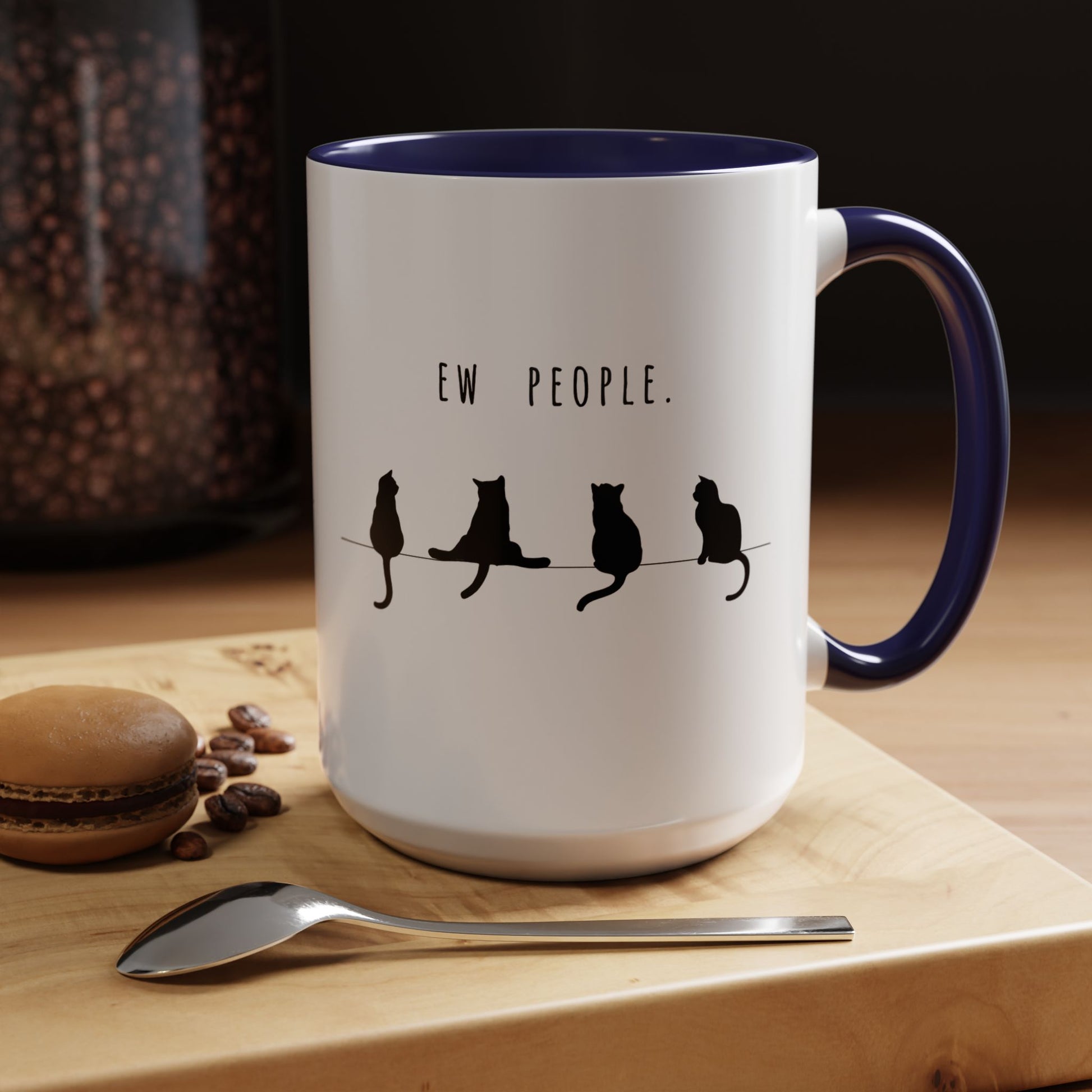 Slow mornings, quiet corners, and the soft company of whiskered judgment. This ceramic mug carries a sly, cat‑centric mood—black silhouettes lounging on a wire with the wry line “Ew people.” It’s the kind of cup you reach for when you want a little private smile before the world wakes up, or when you need a calm pause during a busy day. The colored interior and handle add a playful contrast against the glossy white exterior, while the solid C‑handle feels familiar and steady in your hand. It makes simple coffee, tea, or hot chocolate rituals feel a little more personal and honest—especially for anyone who prefers feline company and dry humor.