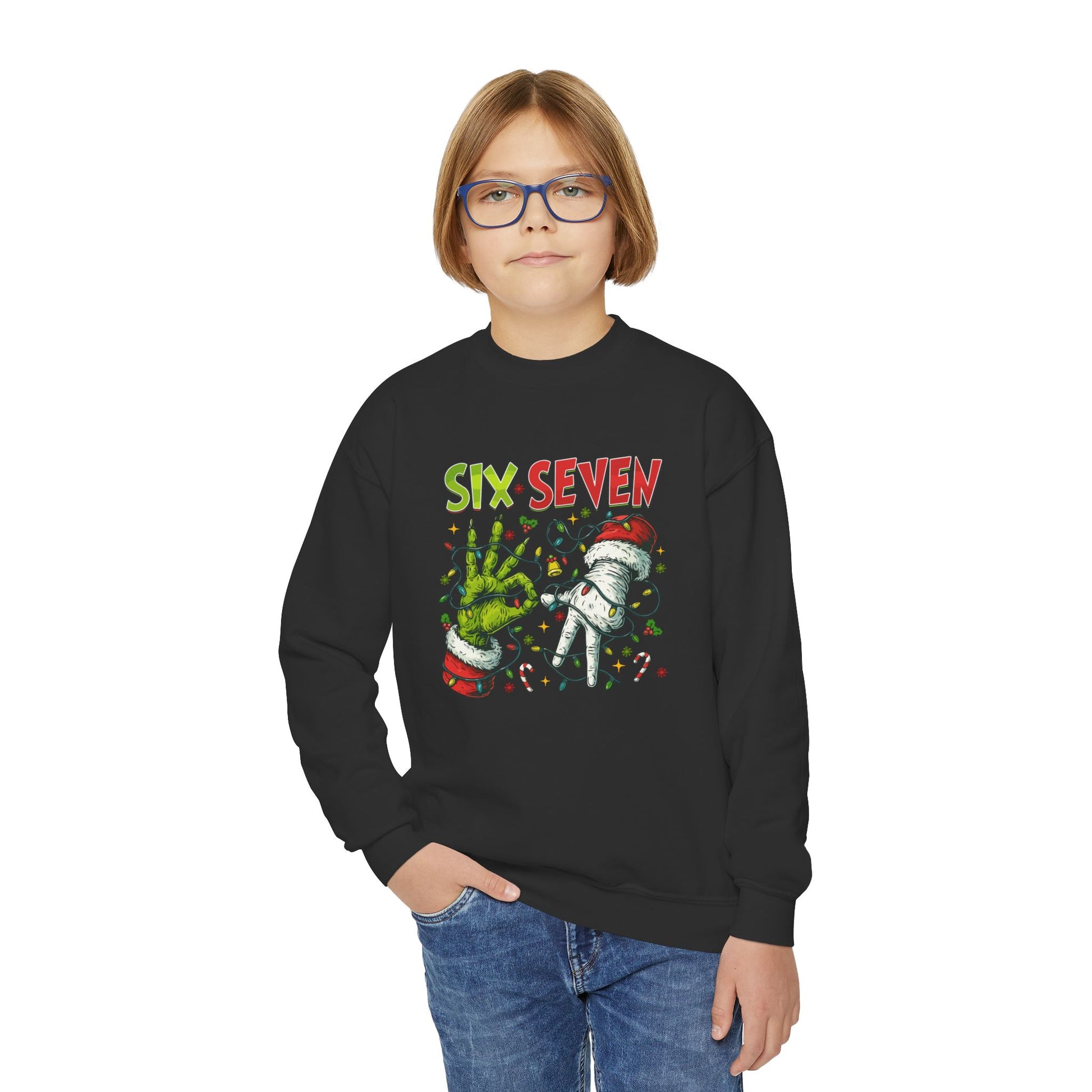 Youth Crewneck Sweatshirt — 'Six Seven' Festive Grinch Holiday Graphic